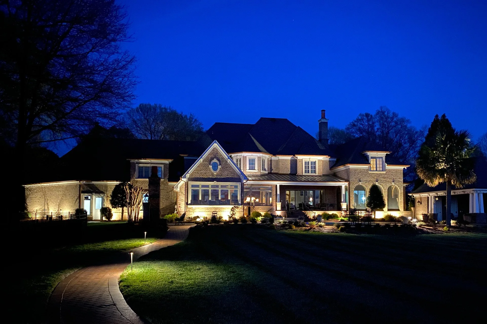 When the back of the home is just as beautiful as the front, you must light it up, especially if that home is perfectly situated on a beautiful lake with a steady flow of boat traffic. The architectural lighting surrounding the back of the home adds the perfect amount of drama and creates a lovely, inviting atmosphere for the homeowners and guests alike.
